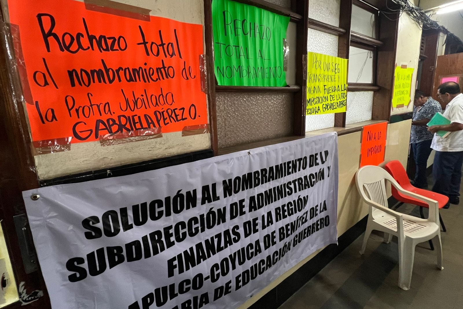 Acapulco; Gro,. A 8 de septiembre del 2025.- Personal de la subdirección de Administración y Finanzas de la delegación de los Servicios Regionales de Acapulco–Coyuca de Benítez tomaron las instalaciones este lunes para rechazar el nombramiento de la maestra jubilada Gabriela Pérez Organista como subdirectora de dicha área, cargo que le fue asignado hace cinco meses.