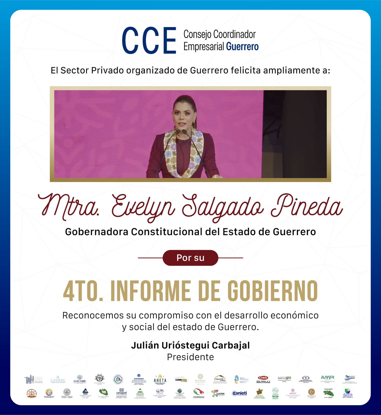 Acapulco, Gro., a 9 de septiembre de 2025.- El Consejo Coordinador Empresarial del Estado de Guerrero, (CCEGRO), que preside Julián Urióstegui Carbajal, felicitó a la gobernadora Evelyn Salgado Pineda, con motivo de su Cuarto Informe de Gobierno.