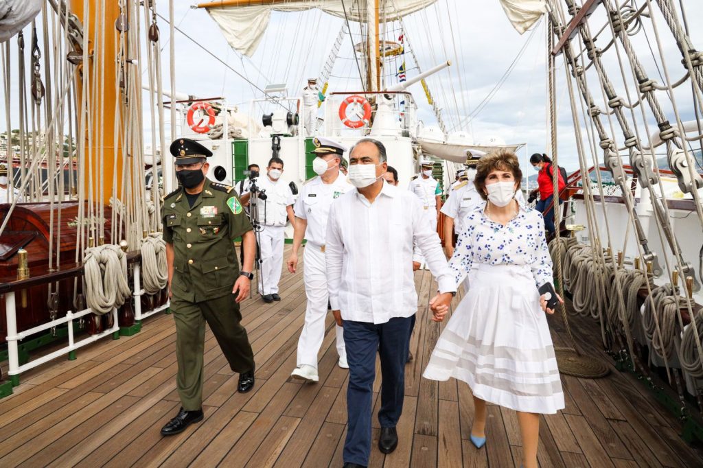 *El gobernador Héctor Astudillo Flores, junto con su esposa Mercedes Calvo dieron la bienvenida al Buque Escuela “Cuauhtémoc”, anclado en el muelle de la Base Naval de Acapulco