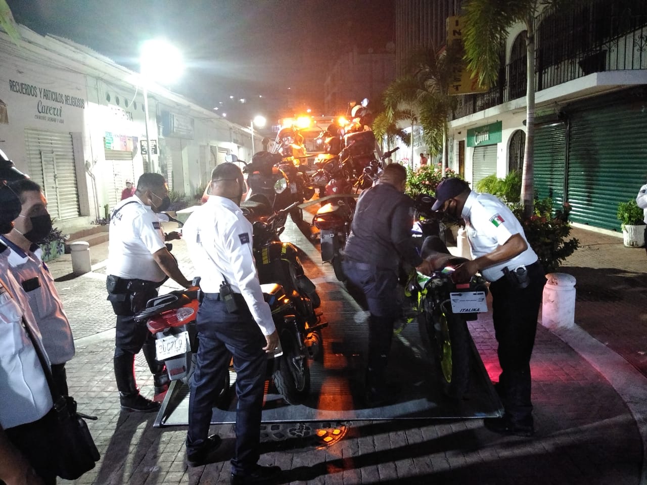 Acapulco, Gro., 15 de octubre de 2020.- Derivado de múltiples quejas por parte de la ciudadanía, la Secretaría de Seguridad Pública, a través de la Policía Vial implementó un dispositivo de recuperación de espacios públicos, en el que retiraron nueve motocicletas del Zócalo de la ciudad.