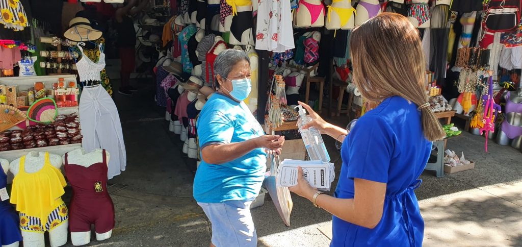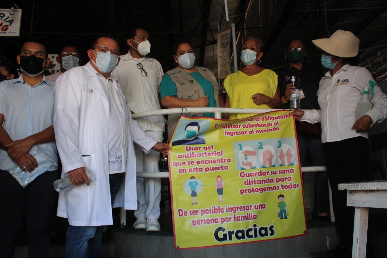 Personal de Salud recorrió el mercado de la Progreso, Bella Vista, Morelos, Hogar Moderno, Icacos, Santa Lucía, La Diana y El Pueblito, donde entregaron trípticos con información referente a la enfermedad, realizaron la entrega de cubrebocas a quienes no portaban y aplicaron alcohol, gel antibacterial a comerciantes y consumidores.