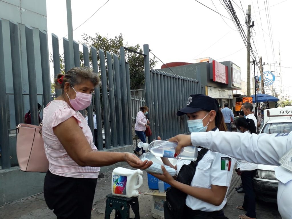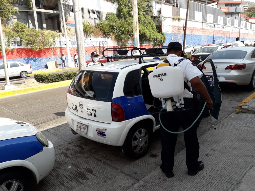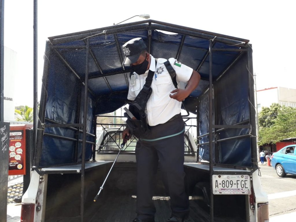 En esta ocasión los uniformados visitaron los sitios de taxis y camionetas ubicados en las avenidas Insurgentes y Adolfo Ruiz Cortines, donde entregaron cubrebocas y gel para manos, contribuyendo con las acciones de desinfección que refuerza el Gobierno Municipal presidido por la alcaldesa Adela Román Ocampo.