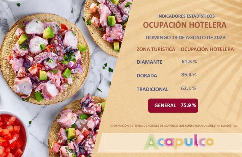 Acapulco, Gro., 13 de agosto de 2023.- El Gobierno encabezado por la presidenta municipal, Abelina López Rodríguez, informa que el puerto de Acapulco amaneció este domingo con una ocupación hotelera general del 75.9 por ciento, de acuerdo con cifras de la Secretaría de Turismo Municipal.