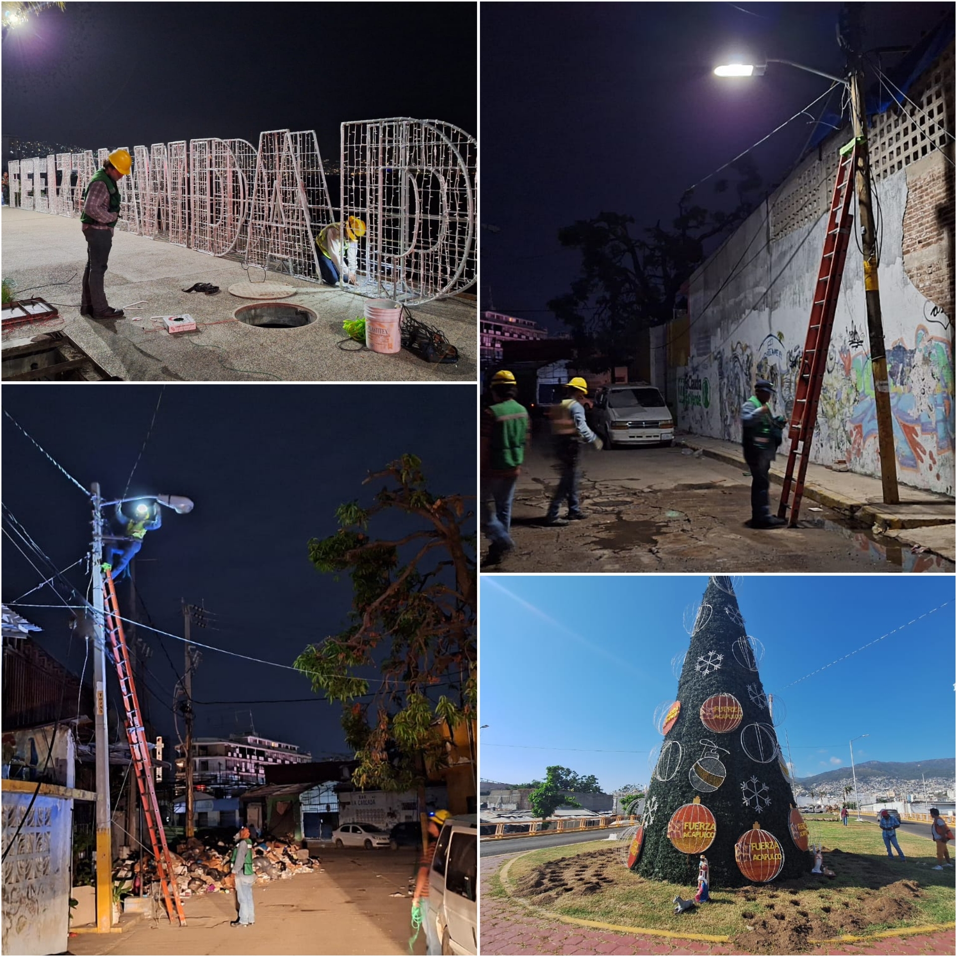Acapulco, Gro., 18 de diciembre del 2023.- El Gobierno Municipal que preside Abelina López Rodríguez, ha logrado rehabilitar en un 80 por ciento el alumbrado público en avenidas principales; se trabaja en coordinación con la Comisión Federal de Electricidad (CFE) en las distintas colonias para garantizar espacios más iluminados, luego de las afectaciones que generó el huracán “Otis”.
