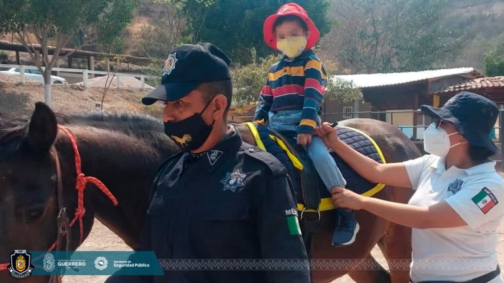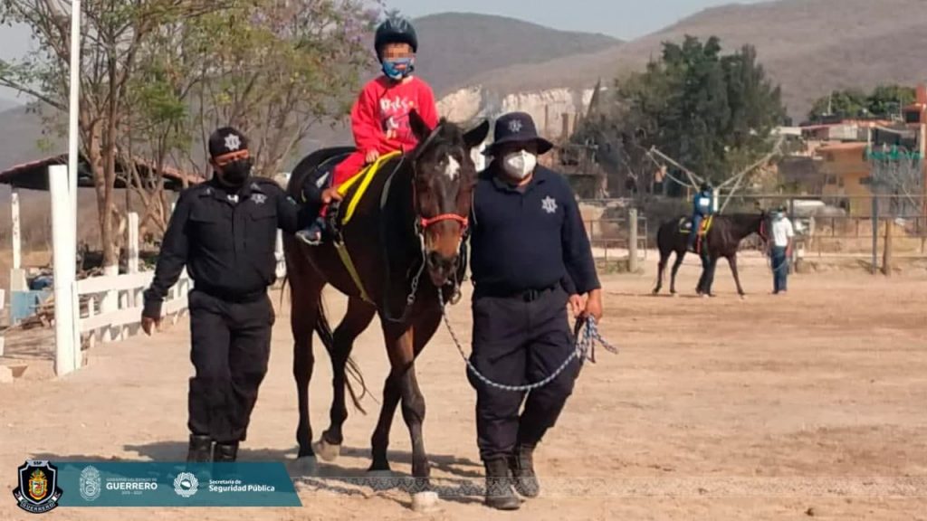 Chilpancingo, Guerrero, 20 de abril del 2021.- Siendo el desarrollo de las niñas y niños una acción prioritaria para el gobierno de Guerrero, por indicaciones del secretario de Seguridad Pública Estatal, David Portillo Menchaca, reinició este martes el Programa de Zooterapias en las instalaciones de la Policía Montada en el municipio de Chilpancingo.