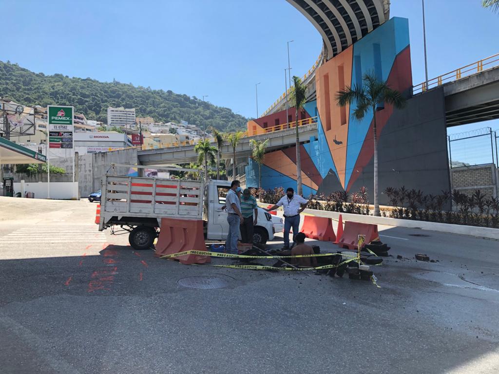 Acapulco, Gro., 05 de noviembre de 2020.- En dos días de intensas maniobras, trabajadores del área operativa de la Comisión de Agua Potable y Alcantarillado del Municipio de Acapulco (Capama) repararon una serie de fugas detectadas en la línea hidráulica de ocho pulgadas de diámetro, del sistema tanque Bandera a tanque Icacos, sobre la avenida Escénica.