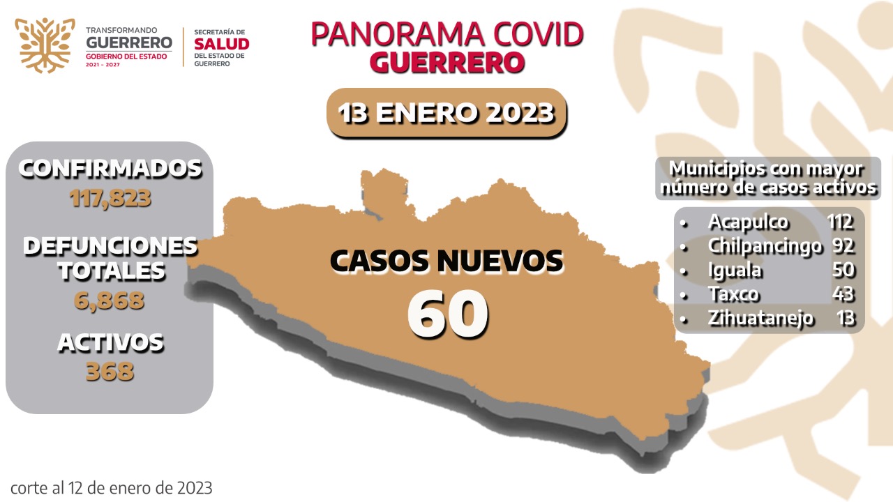 Salud Guerrero confirmó que al 12 de enero hay 368 casos activos de COVID-19, por lo que se indica que la entidad acumula 117,823 casos confirmados y 6,868 defunciones, por lo que se reitera el llamado a mantener las medidas preventivas para evitar el aumento de contagios del virus SARS-CoV-2.