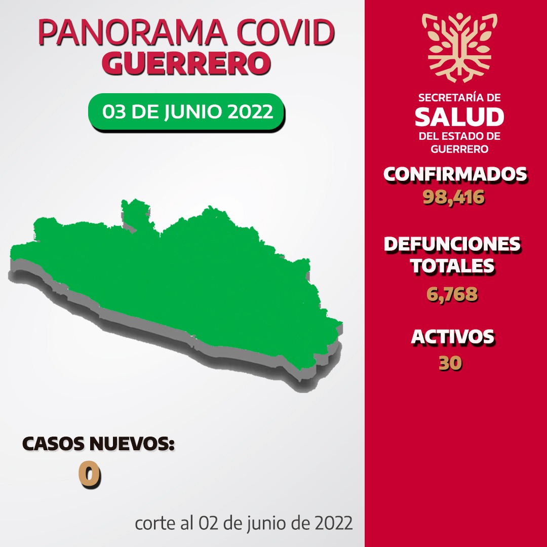 Chilpancingo, Gro., 03 de junio 2022.- La Secretaría de Salud informó que al corte del 02 de junio, la entidad se mantiene en color verde del semáforo de riesgo epidemiológico con 30 casos activos de Covid-19, sin ninguna defunción en las últimas 24 horas.