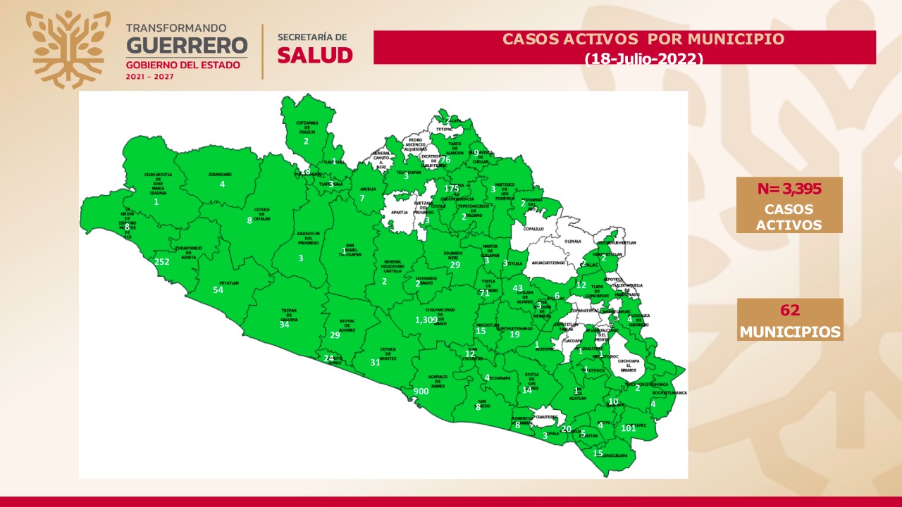 Chilpancingo de los Bravo, 1,309; Acapulco de Juárez, 900; Zihuatanejo de Azueta, 252; Iguala de la Independencia, 175; Ometepec, 101; Taxco de Alarcón, 76; Tixtla de Guerrero, 71; Petatlán, 54; Chilapa de Álvarez, 43; y Tecpan de Galeana, 34, son los municipios con mayor incidencia en casos activos que se han presentado, esto de acuerdo a los registros que presenta la SSG, que detalla que, desde el inicio de la pandemia, Guerrero acumula 106,353 casos confirmados y 6,779 defunciones por COVID-19.