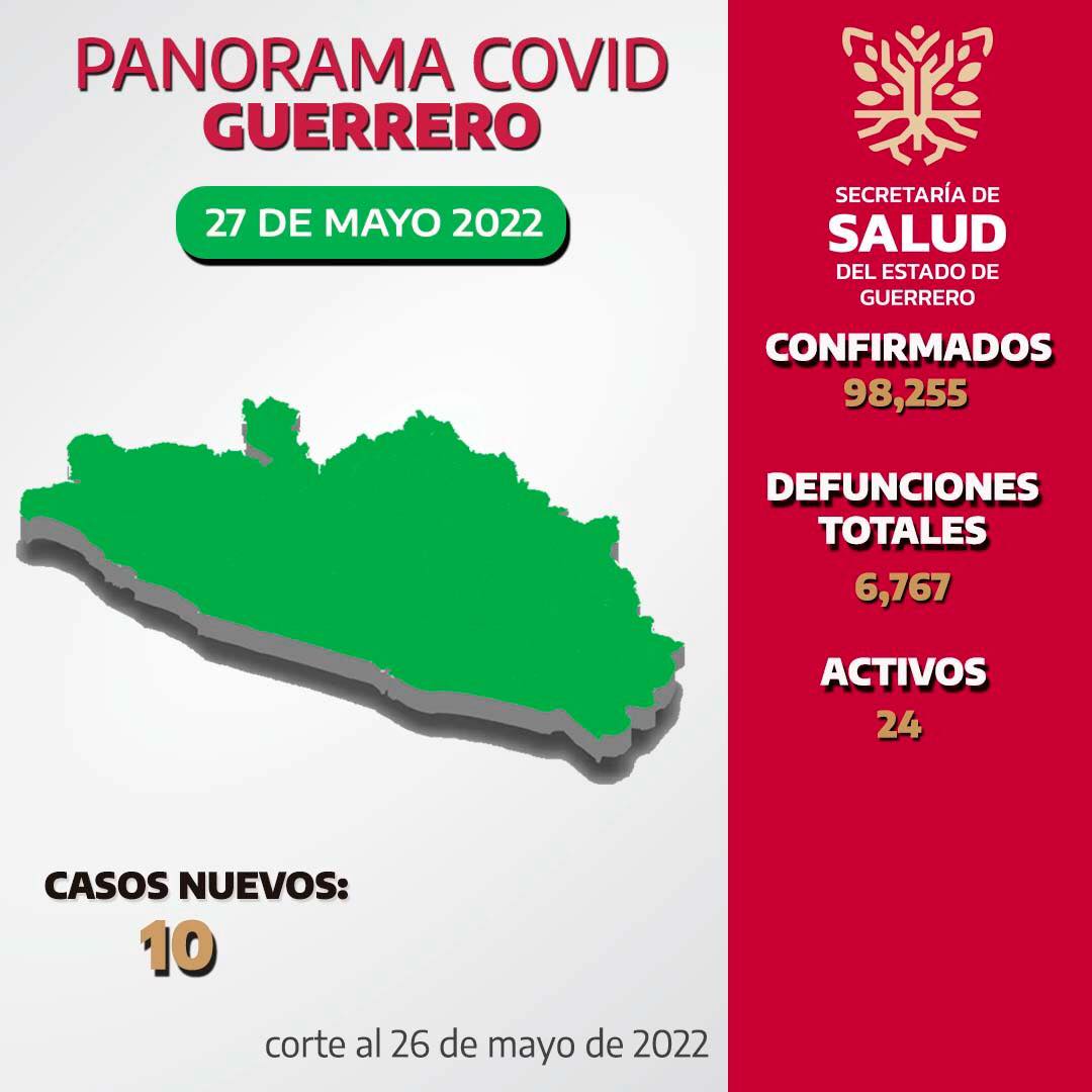 Chilpancingo, Gro., 27 de mayo 2022.- La Secretaría de Salud en la entidad informó que de acuerdo al reporte técnico “Covid-19 Guerrero”, a la fecha se tiene registro de 24 casos activos, confirmando 10 nuevos contagios y ninguna defunción en las últimas 24 horas.