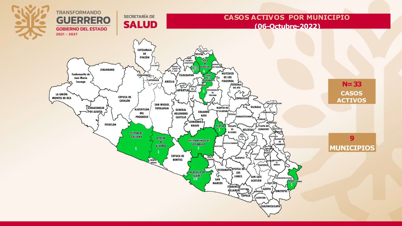 La dependencia estatal destacó que la entidad ocupa el lugar 28 a nivel nacional en casos activos, distribuidos en 9 municipios, principalmente en Acapulco, con 18; Taxco, 4; Chilpancingo e Iguala, con 3, y Atoyac, Ixcateopan, Tecpan, Tixtla y Xochistlahuaca, con 1 cada uno.