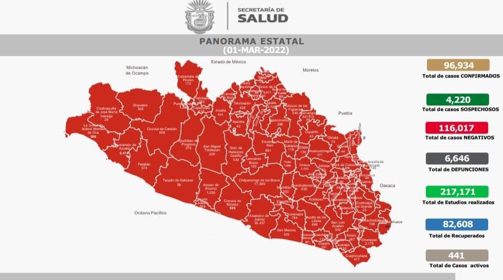 De manera especial, detalló que desde el inicio de la pandemia por Covid-19, en Guerrero se acumulan 96,934 casos confirmados y 6,646 defunciones, y que a nivel nacional se registran 40,999 casos activos, y el estado de Guerrero se mantiene en el lugar 25 con 441, que se ubican en Chilpancingo con 146; Acapulco, 120; Ometepec, 25; Taxco, 24; Chilapa, 20; Zihuatanejo, 19; Tixtla, 17; Iguala, 10; Eduardo Neri, 9, y Tlapa, 9.