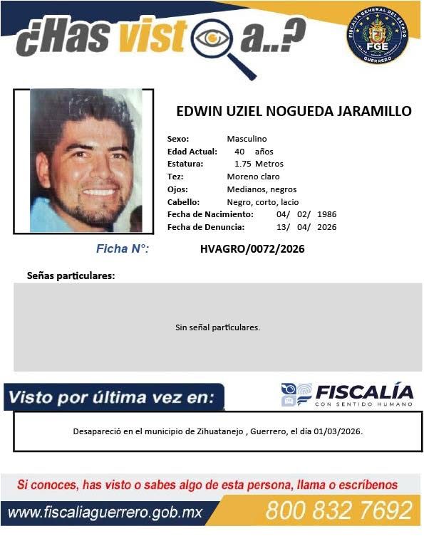 Zihuatanejo, Gro., 14 de abril de 2026.— La Fiscalía General del Estado de Guerrero activó una ficha de búsqueda para localizar a Edwin Uziel Nogueda Jaramillo, de 40 años de edad, hijo del comunicador Asunción Nogueda Fierro, director del portal El Diario de Zihuatanejo, quien fue reportado como desaparecido en este municipio.