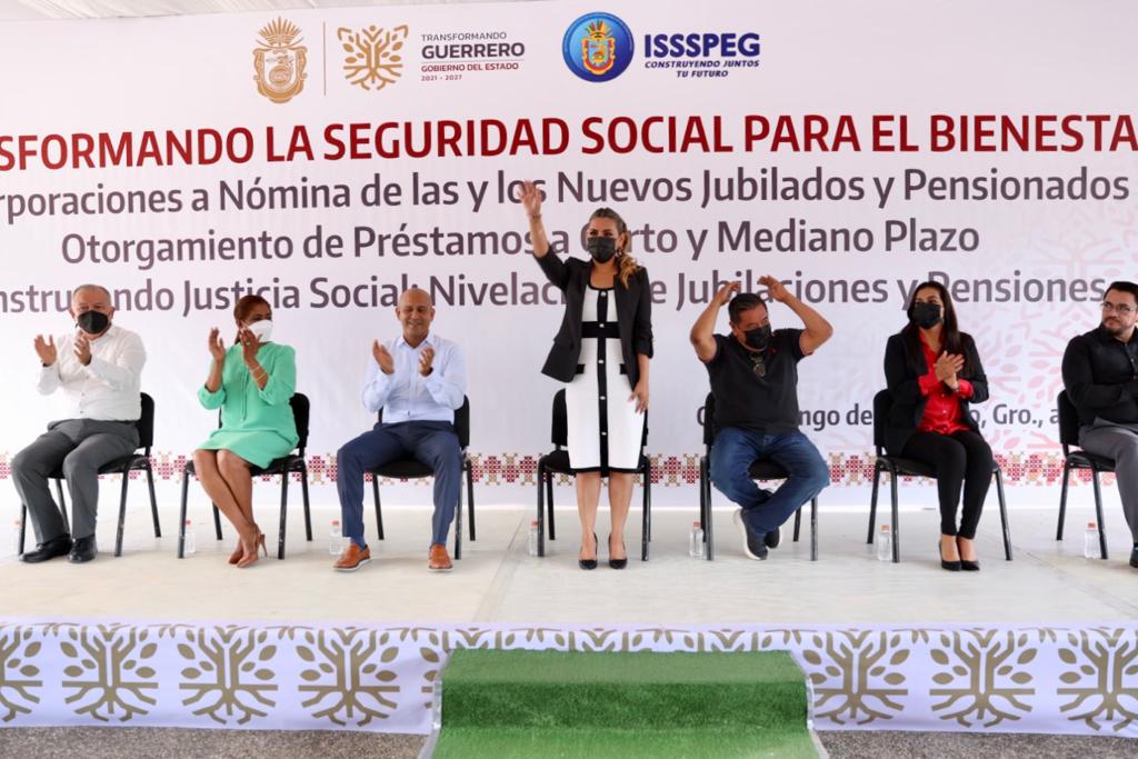 La gobernadora, indicó que está avanzando con pasos firmes para hacer de la seguridad social una realidad en Guerrero, con lo que se garantiza este derecho humano a 120 nuevos beneficiarios del ISSSPEG que representa una derogación mensual estimada en 1.1 millones de pesos. “El dinero ya no se queda en manos de funcionarios el dinero se queda donde tiene que estar con las y los trabajadores del ISSSPEG”.