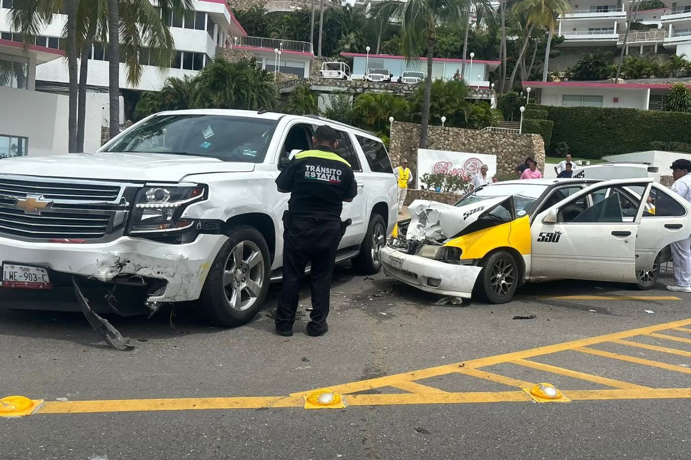 De acuerdo con los primeros reportes, el percance ocurrió alrededor de las 12:40 del día, cuando la camioneta salía del acceso al hotel y el taxi circulaba por los carriles en dirección Puerto Marqués-Base.