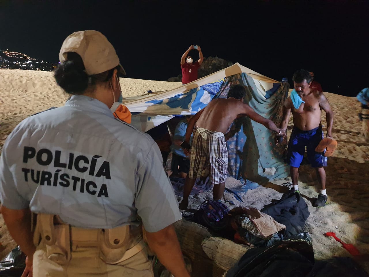 “Identificamos a estas personas y se les exhortó a que se retiraran del área, tenían unos palos enterrados como postes en la arena y tenían enredadas unas sábanas, lo cual figuraba como una especie de casita, ellos estaban pernoctando al interior, tenían comida y ropa”, explicó.
