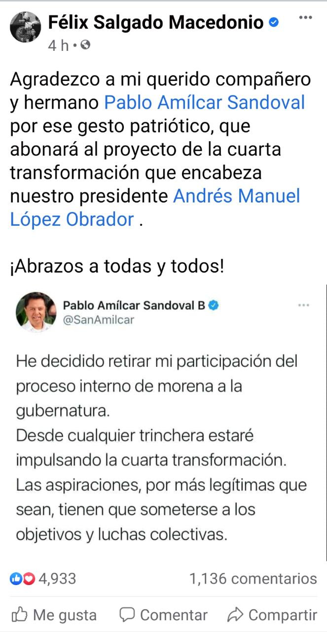 “Agradezco a mi querido compañero y hermano Pablo Amílcar Sandoval por ese gesto patriótico, que abonará al proyecto de la cuarta transformación que encabeza nuestro presidente Andrés Manuel López Obrador”, escribió Félix Salgado Macedonio en sus redes sociales.
