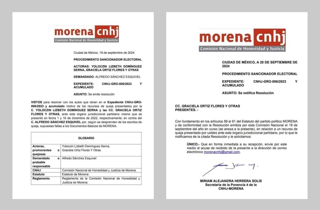 Ciudad de México, 20 de septiembre de 2024. La Comisión Nacional de Honestidad y Justicia de Morena declaró fundada la queja de la ex presidenta de la Junta de Coordinación Política (Jucopo) en el Congreso de Guerrero, Yoloczin Domínguez Serna, por violencia política en razón de género ejercida en su contra por su antecesor en el cargo, Alfredo Sánchez Esquivel, y acordó suspenderlo en sus derechos partidarios durante seis meses y a la reparación del daño.