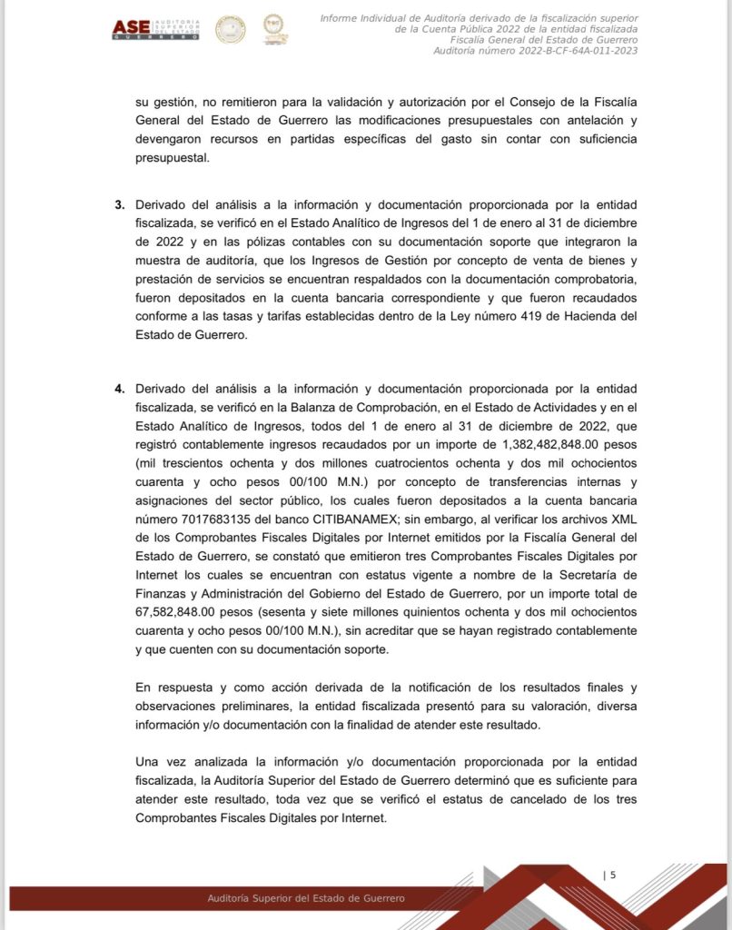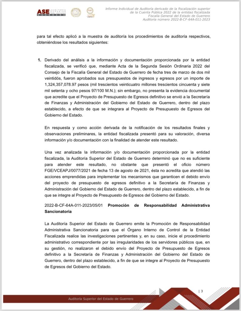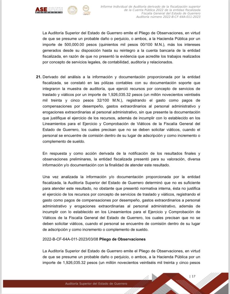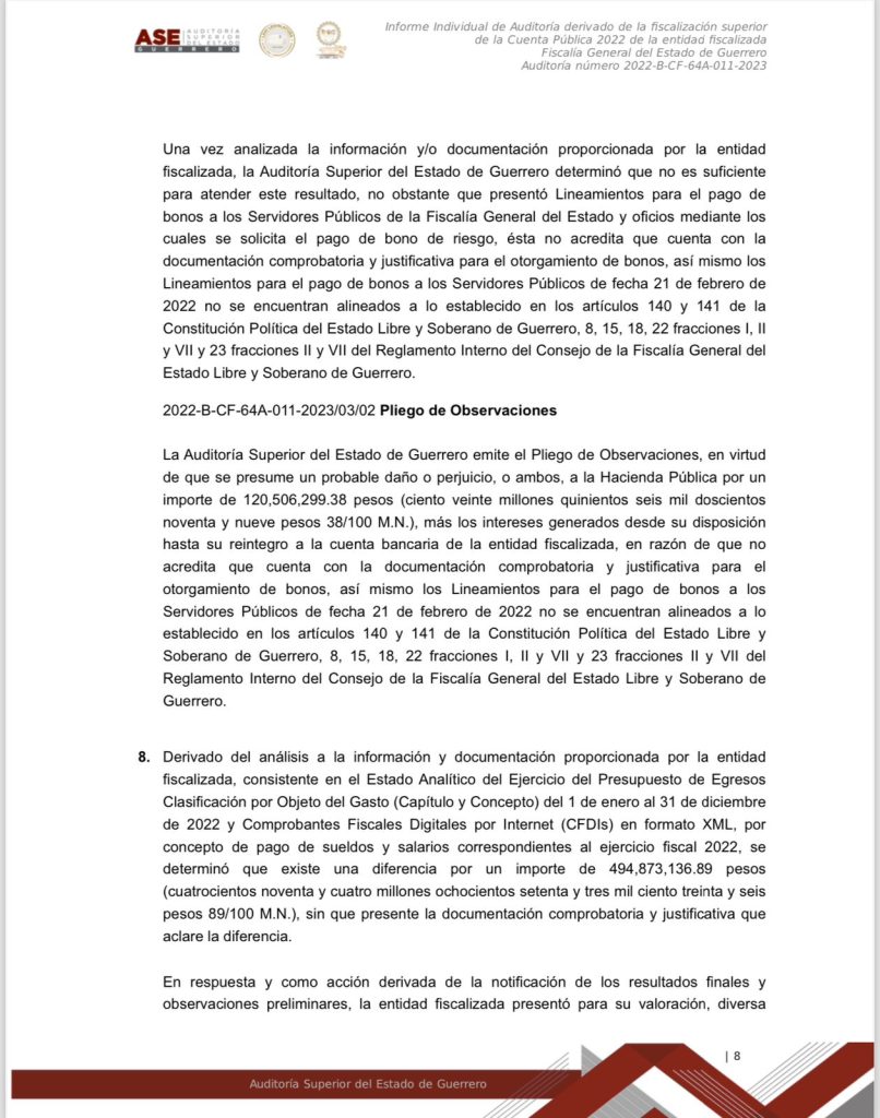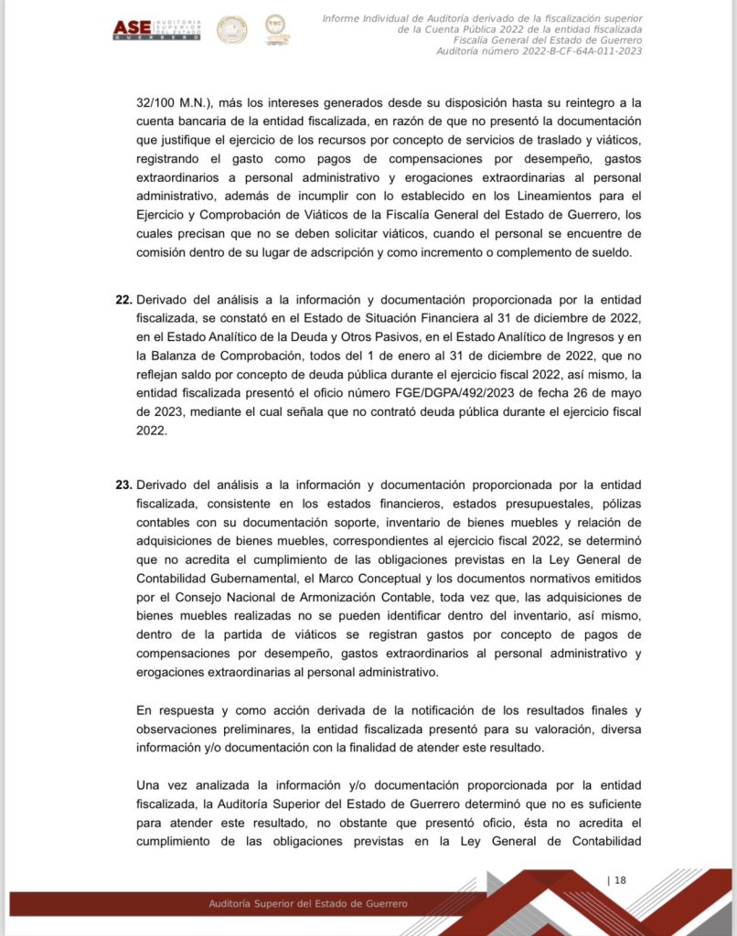 Chilpancingo, Gro. a 15 de marzo del 2024.- Documentos obtenidos donde se da a conocer el informe individual de la Auditoría derivado de la fiscalización superior de la Cuenta Publica 2022 de la entidad fiscalizada Fiscalía General del Estado de Guerrero, se dan a conocer montos, números y cifras, así como el mal manejo y destino oculto de los recursos públicos de esa dependencia, que en ese entonces estaba a cargo ya de Sandra Luz Valdovinos Salmerón.