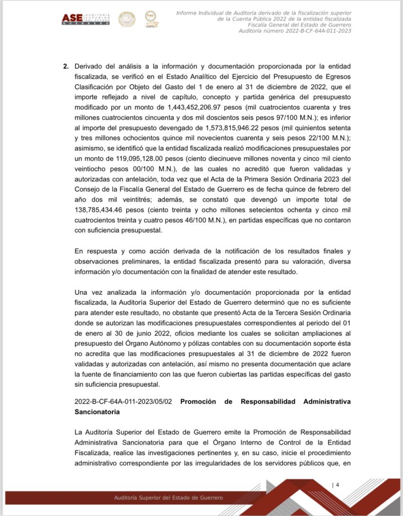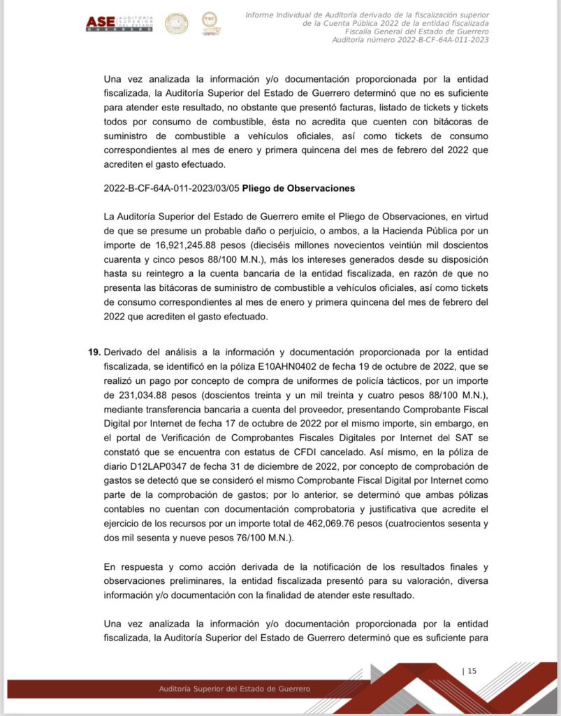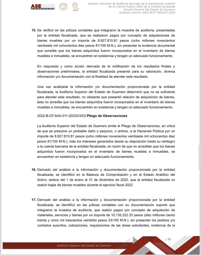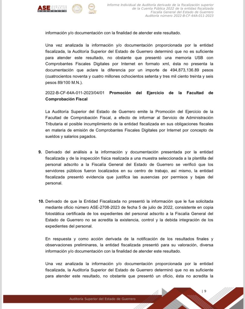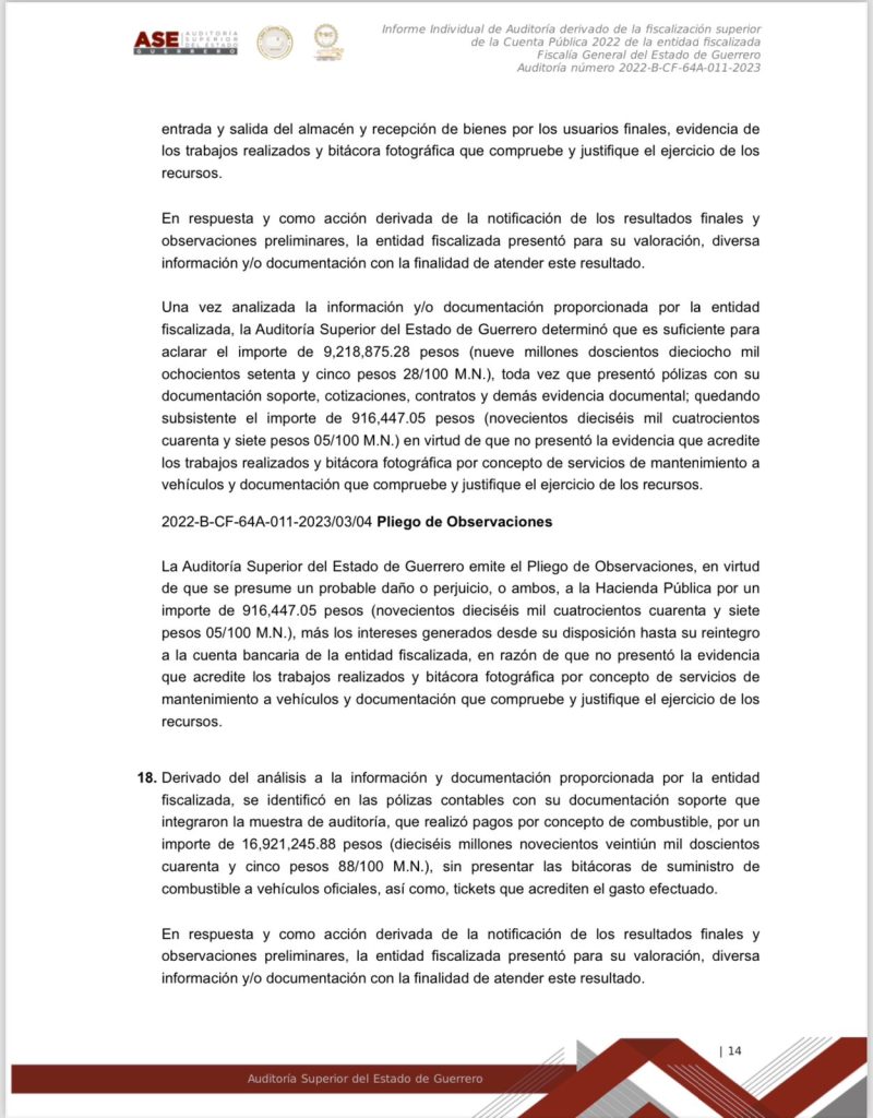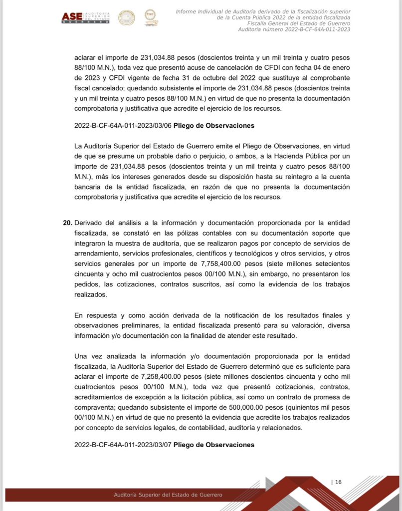 Chilpancingo, Gro. a 15 de marzo del 2024.- Documentos obtenidos donde se da a conocer el informe individual de la Auditoría derivado de la fiscalización superior de la Cuenta Publica 2022 de la entidad fiscalizada Fiscalía General del Estado de Guerrero, se dan a conocer montos, números y cifras, así como el mal manejo y destino oculto de los recursos públicos de esa dependencia, que en ese entonces estaba a cargo ya de Sandra Luz Valdovinos Salmerón.