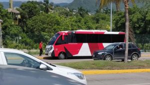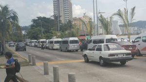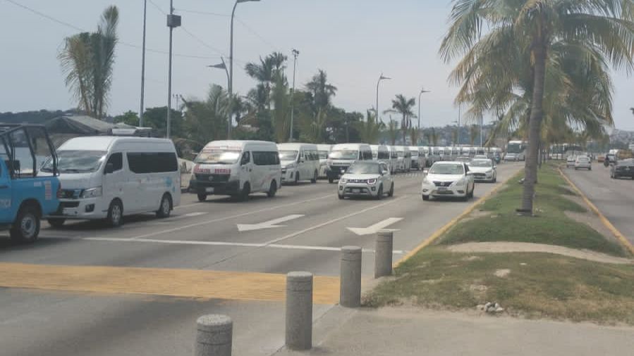 Acapulco,Gro., a 04 de octubre del 2023.-42 urvans del transporte público de Acapulco y dos autobuses estrella de oro se concentraron en el punto conocido como el Asta Bandera para salir en caravana para estar presentes en la reunión informativa con la Coordinadora de Defensa de la Cuarta Transformación, Claudia Sheinbaum Pardo en la ciudad de Chilpancingo.