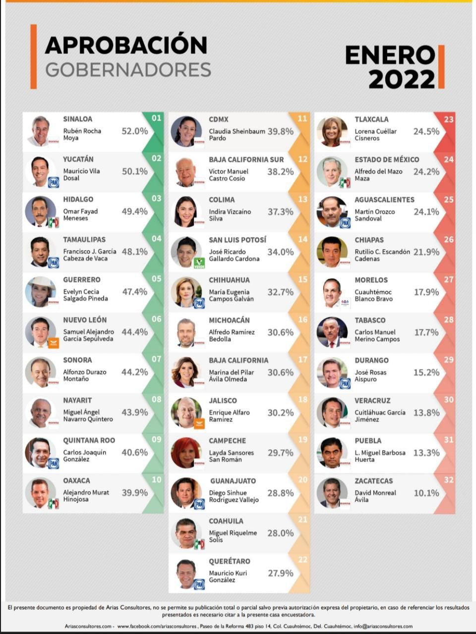 Evelyn Salgado Pineda, inició este 2022 en Guerrero, entidad que gobierna desde el 15 de octubre del 2021, con una aprobación a su desempeño del 47.4 por ciento, cifra que también la coloca en el segundo sitio de la lista de gobernadores de Morena en el país, solo por debajo de su homólogo de Sinaloa Rubén Rocha Moya.