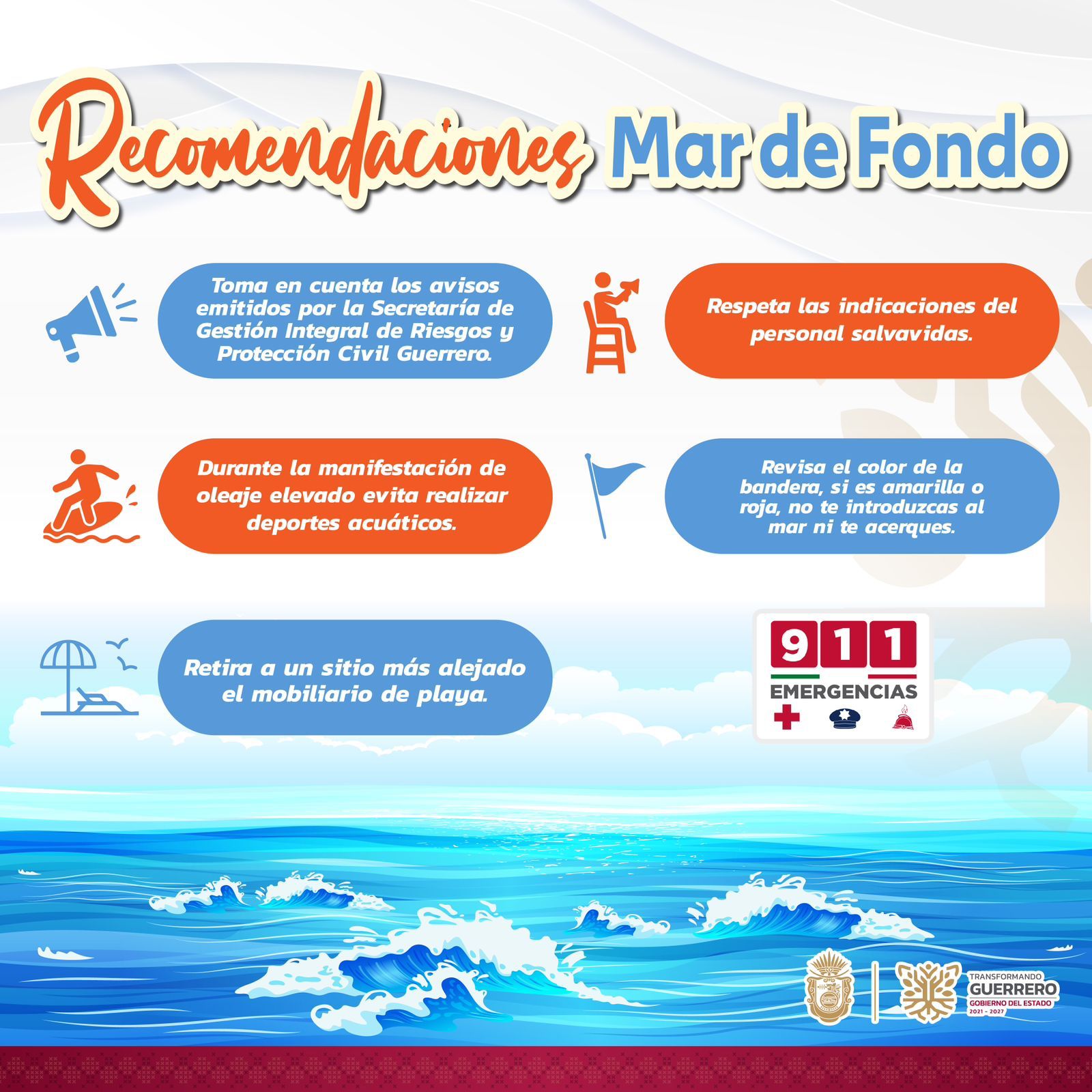 La Secretaría de Gestión Integral de Riesgos y Protección Civil, recomienda a la población no realizar deportes acuáticos, no introducirse al mar, ni caminar sobre la franja de arena y atender las recomendaciones del personal salvavidas y de protección civil.