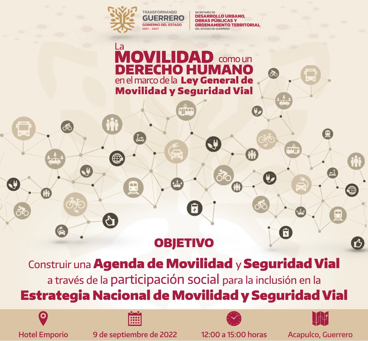 Chilpancingo, Gro., 07 de septiembre de 2022.- El gobierno del estado a través de la Secretaría de Desarrollo Urbano, Obras Públicas y Ordenamiento Territorial, llevará a cabo el próximo viernes 9 de septiembre en el puerto de Acapulco el Foro Estatal: La Movilidad como un Derecho Humano en el Marco de la Ley General de Movilidad y Seguridad Vial.