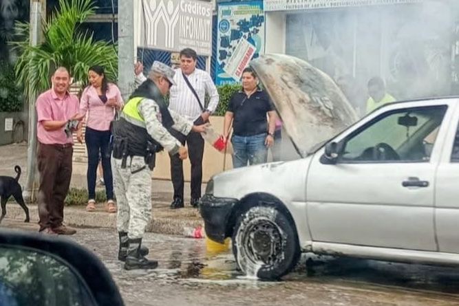 Acapulco; Gro,. A 29 de enero del 2026.- Un conato de incendio se registró en un vehículo que circulaba sobre la avenida Costera Miguel Alemán a la altura del edificio que anteriormente albergó las instalaciones del periódico Novedades de Acapulco.