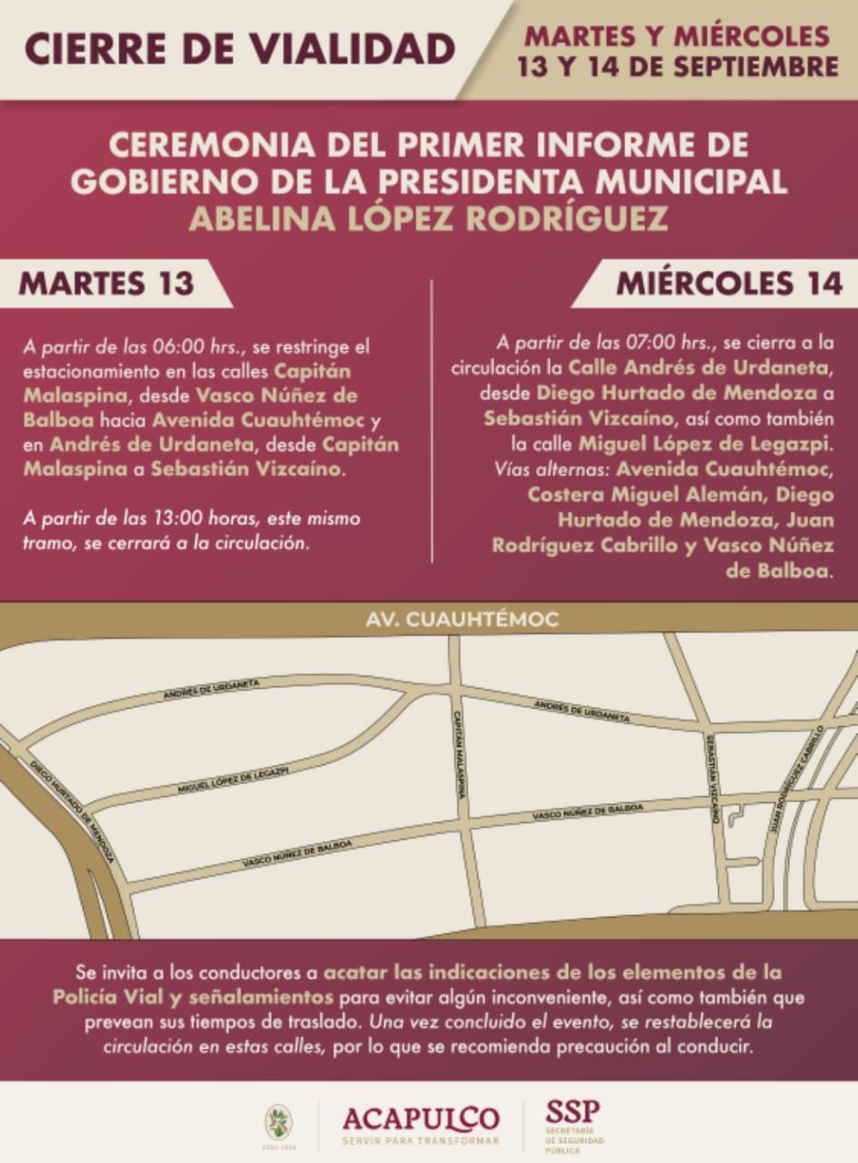 Acapulco, Gro., 12 de septiembre de 2022.– La Secretaría de Seguridad Pública Municipal, informa a la población en general, las restricciones de estacionamiento y circulación que, con motivo del Primer Informe de Gobierno de la alcaldesa, Abelina López Rodríguez, que rendirá el miércoles 14 de septiembre. Se pide a las y los ciudadanos tomar sus medidas y rutas alternas.