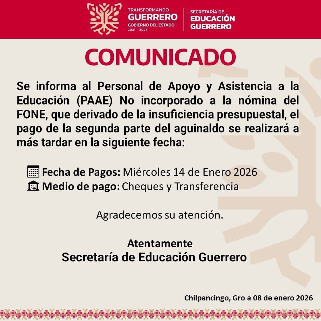 La Secretaría de Educación Pública del Estado de Guerrero informó, a través de su plataforma oficial de Facebook indicó que no fue posible cubrir el pago de la segunda parte del aguinaldo correspondiente al personal debido a una insuficiencia presupuestal que afecta a la dependencia.