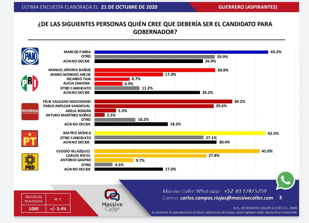 En los otros partidos, de acuerdo a Massive Caller, el abanderado del PAN sería el alcalde taxqueño Marcos Efrén Parra; del PRI el senador Manuel Añorve; de MORENA el senador Félix Salgado y del PT Beatriz Mojica Morga.