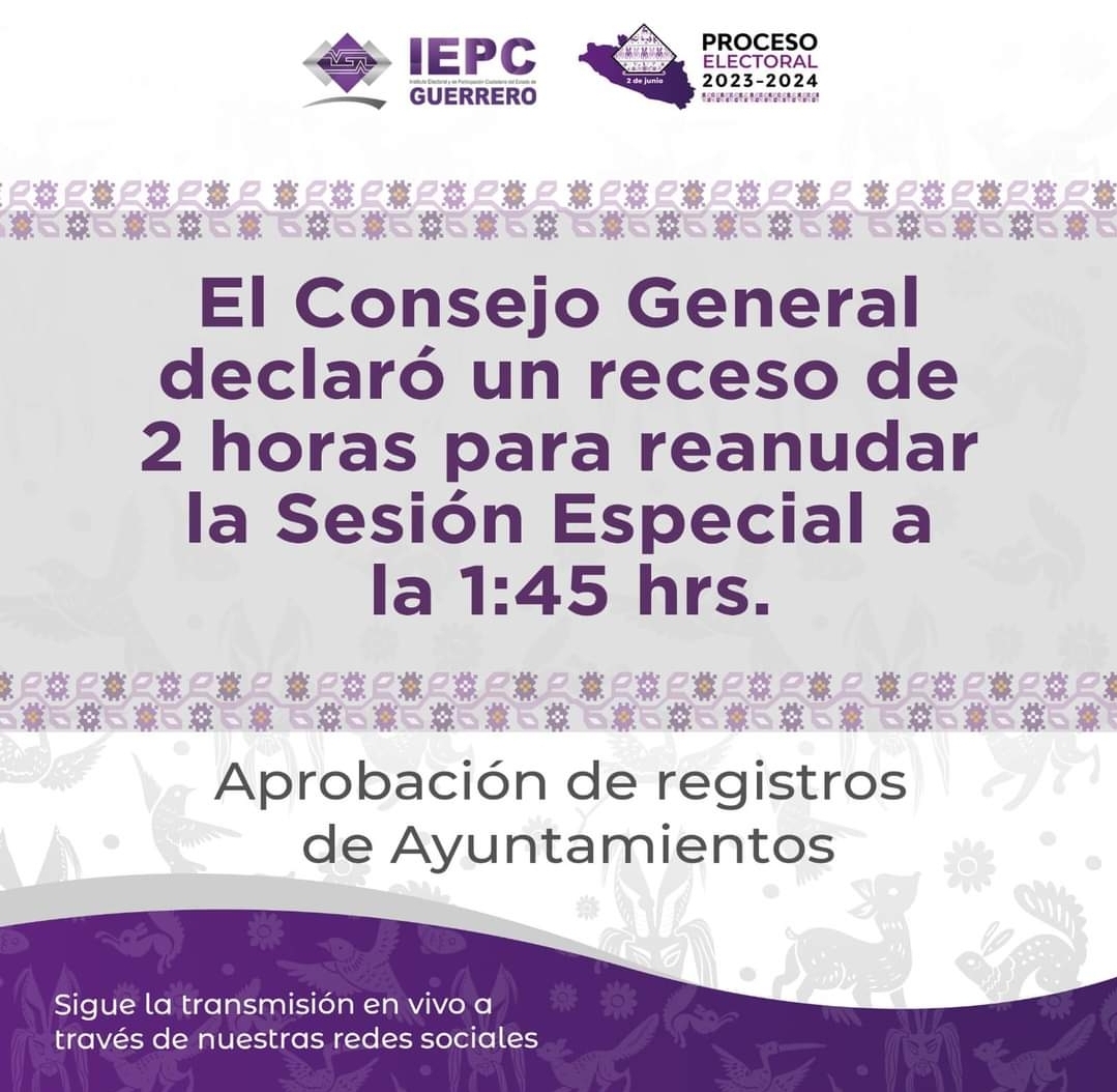 Y los resolutivo de la sesión, estarían listos pasada las 02:30 de la madrugada de este 20 de abril, lo que impidió los arranques de campaña en los primeros minutos del día de varios candidatos en la entidad, incluyendo el de Abelina López en Acapulco.
