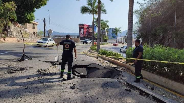 Acapulco,Gro., a 21 de junio del 2023.-Durante la mañana de este miércoles, se presentó un socavón en la avenida escénica a escasos metros de la entrada del fraccionamiento Brisas Guitarrón.