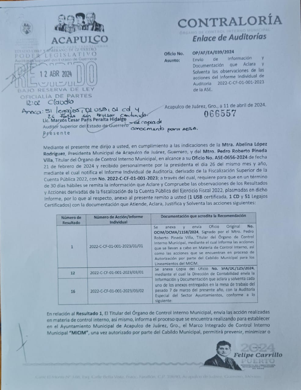 Cabe reiterar, que este informe con el que se solventan las observaciones fiscales, fue sellado como recibido desde el 12 de abril de 2024 por la Auditoría Superior del Estado de Guerrero.