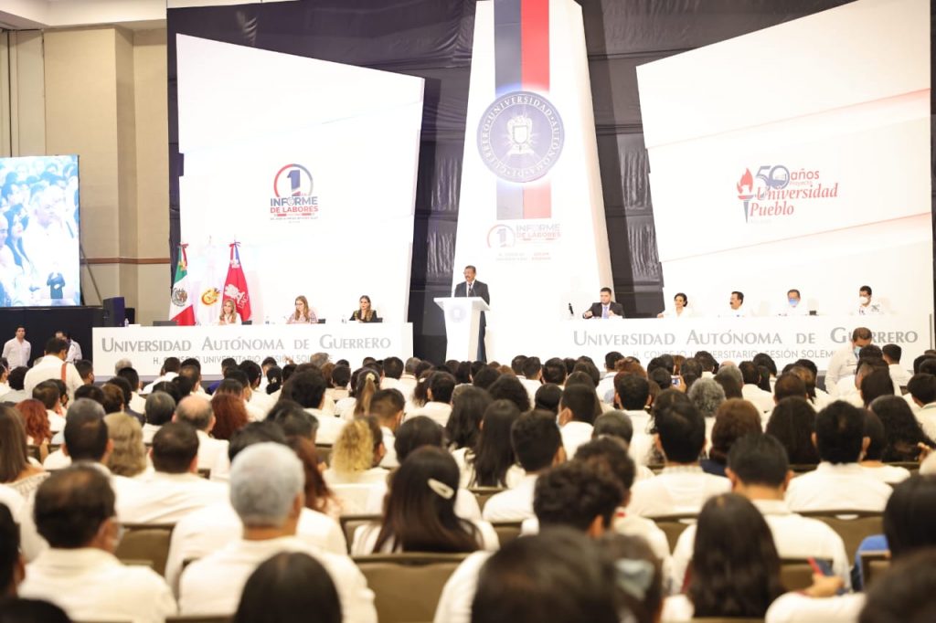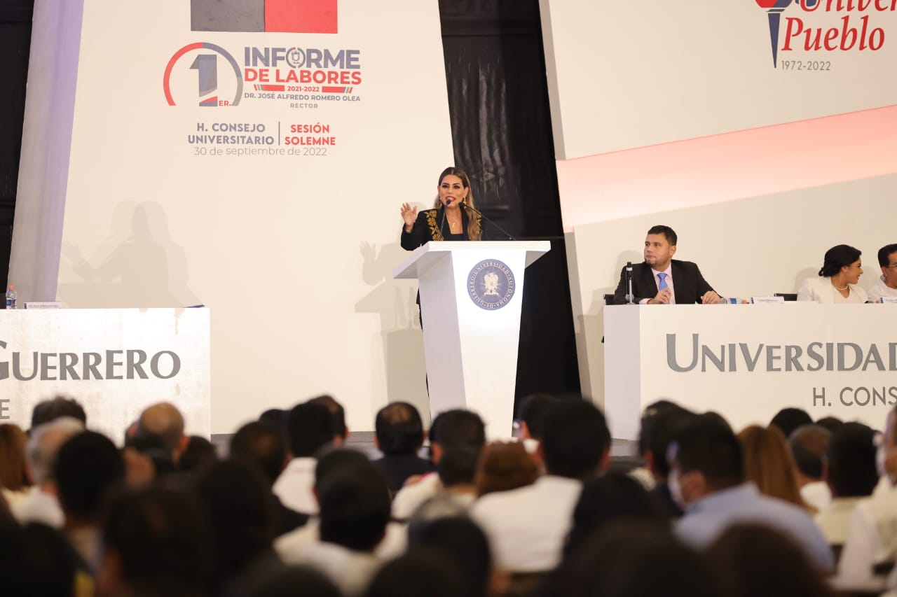 “La Universidad Autónoma de Guerrero cuenta con el apoyo del gobierno estatal. Somos sus aliadas, somos sus aliados y vamos a trabajar de la mano, por nuestra querida universidad”, expresó la mandataria ante los integrantes del Consejo Universitario, así como personal docente, administrativo y alumnos de la UAGro.