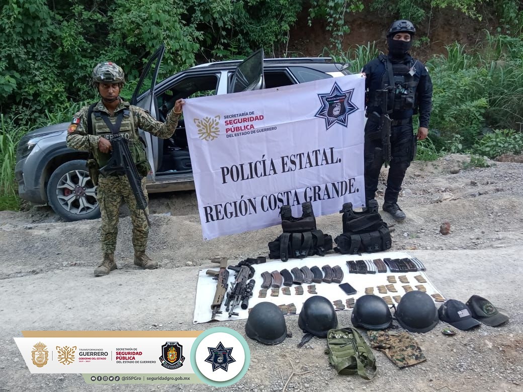 En una primera intervención, en la localidad de El Zarco, municipio de Zihuatanejo, personal de la Policía Estatal, el Ejército Mexicano y la Fiscalía General del Estado aseguraron tres armas largas, 26 cargadores, 610 cartuchos útiles, tres fornituras, un chaleco antibalas y un vehículo con reporte de robo.
