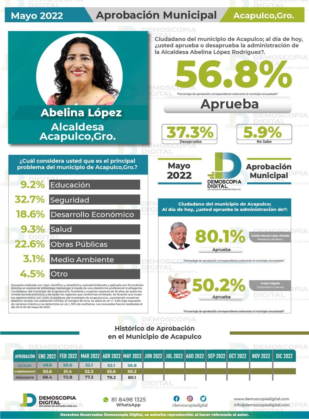 En su último informe, correspondiente al mes de mayo, en el que se analizó también a otros alcaldes de Guerrero, Abelina López obtuvo una aprobación del 56.8 por ciento.