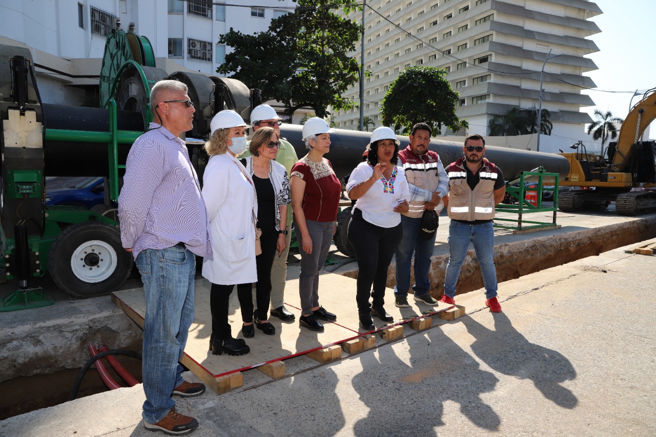 Junto a la directora general de Servicios de Salud del Instituto Mexicano del Seguro Social para el Bienestar (IMSS-BIENESTAR), Gisela Lara Saldaña, de los directores, de Obras Públicas y Salud Municipal, Alfredo García Vázquez y Aniceto Leguizamo Dimas, respectivamente, Abelina López, verificó el avance de los trabajos de sustitución de los 867 metros lineales en el colector Nao Trinidad, que comprende del tramo, Las Torres Gemelas a La Condesa.