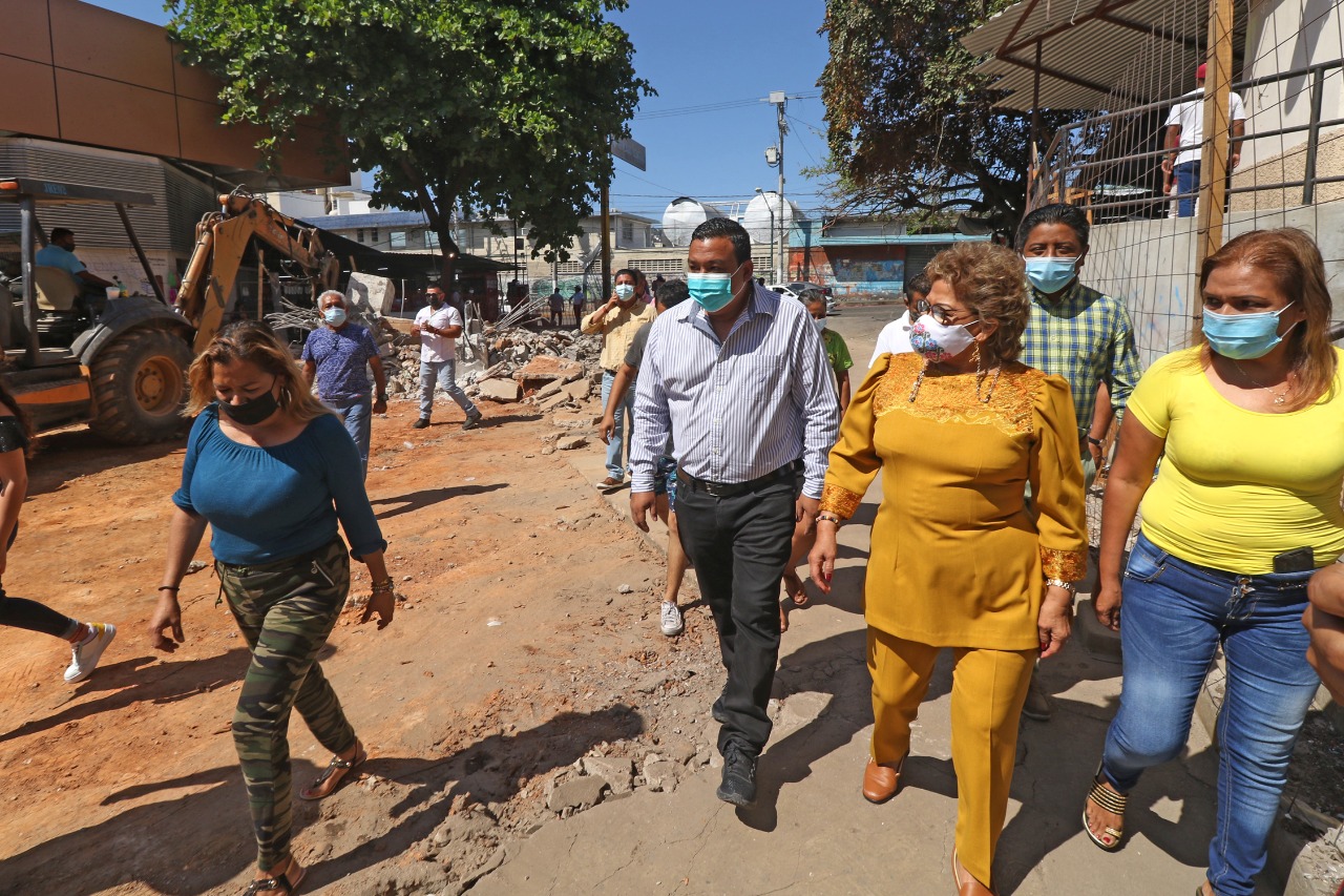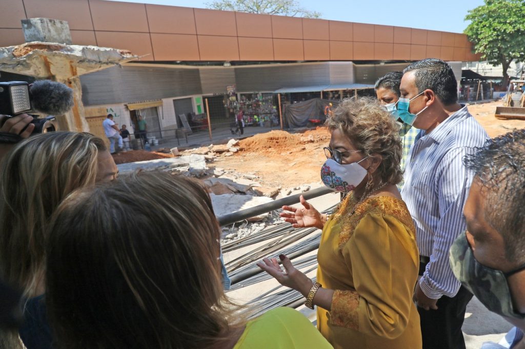 Acompañada por el coordinador de Servicios Públicos Municipales, Juan Carlos Manrique García y el director de Mercados y Centros de Abasto, Bismark Cayetano Bedolla Platero, la alcaldesa recorrió a pie la obra en proceso y constató los avances de la demolición de estructuras de concreto.