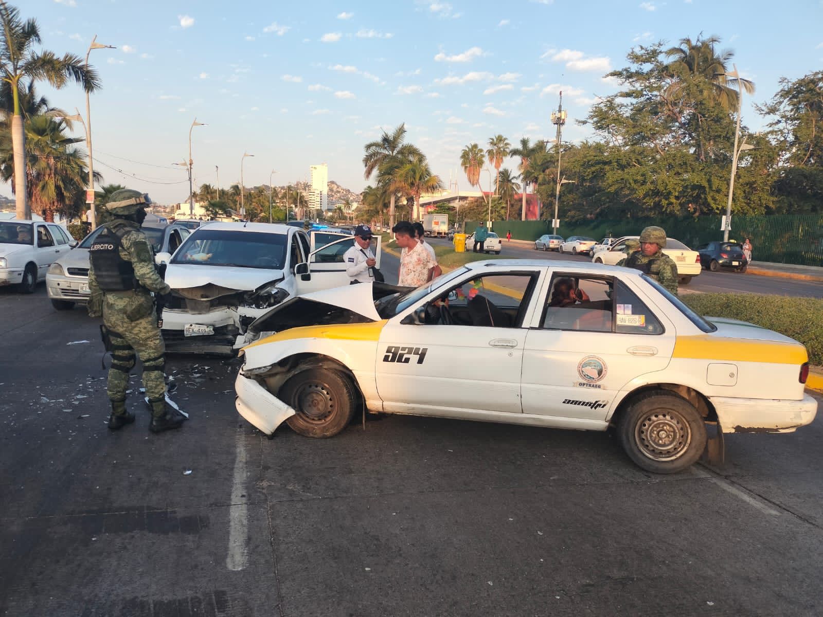 Acapulco,Gro., a 13 de marzo del 2023.-El conductor de un taxi colectivo provocó un accidente frontal en la Costera Miguel Alemán a escasos metros del Parque Papagayo.