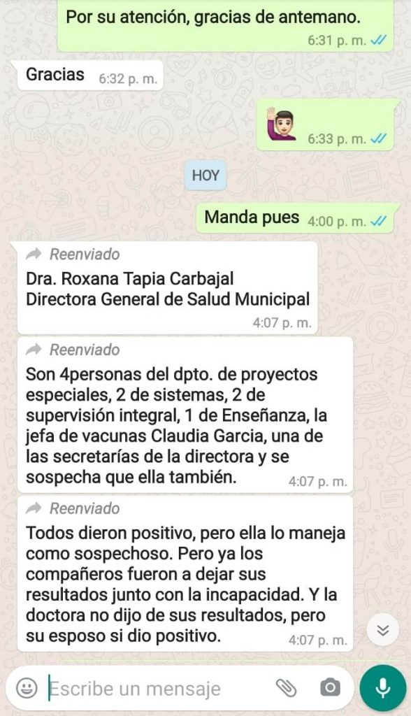 Fuentes de trabajadores de la institución, que se reservaron el nombre, por temor a posibles represalias, manifestaron que la propia directora de la dependencia Roxana Tapia Carbajal, no se ha presentado ya dos días a laborar y que el esposo de esta podría estar infectado de Coronavirus tras dar positivo en una prueba del SARS-CoV-2.