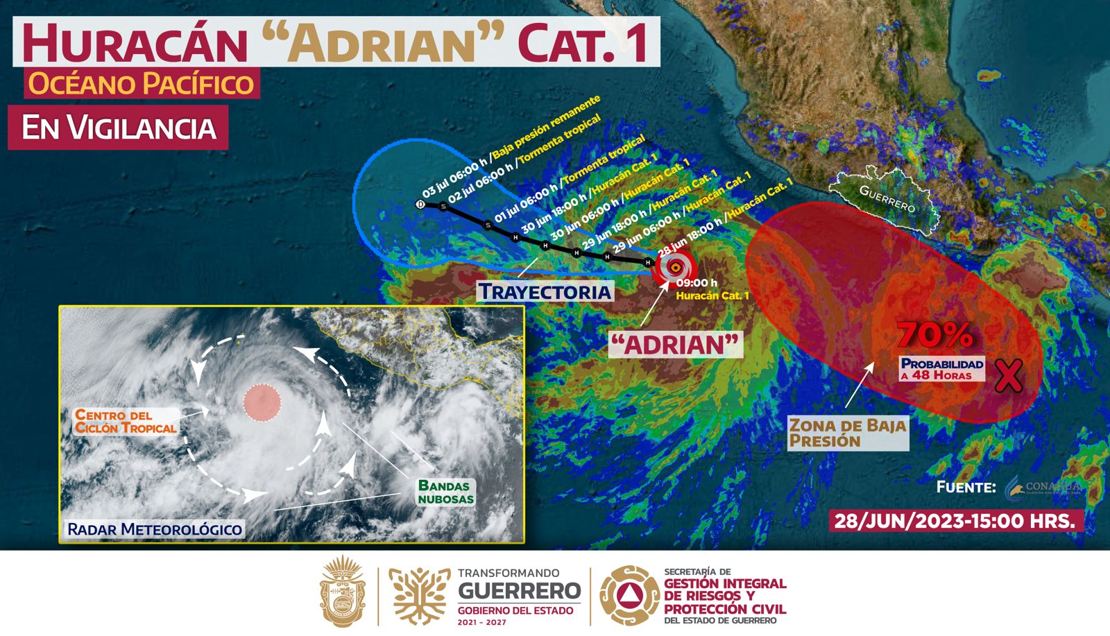 Chilpancingo, Gro., 28 de junio de 2023.- Esta tarde, la Tormenta Tropical “Adrián” se intensificó a huracán categoría uno, ubicándose a 575 kilómetros al suroeste de Manzanillo, Colima, presentando vientos máximos sostenidos de 120 kilómetros por hora, continuando su desplazamiento hacia el oeste a 13 kilómetros por hora.