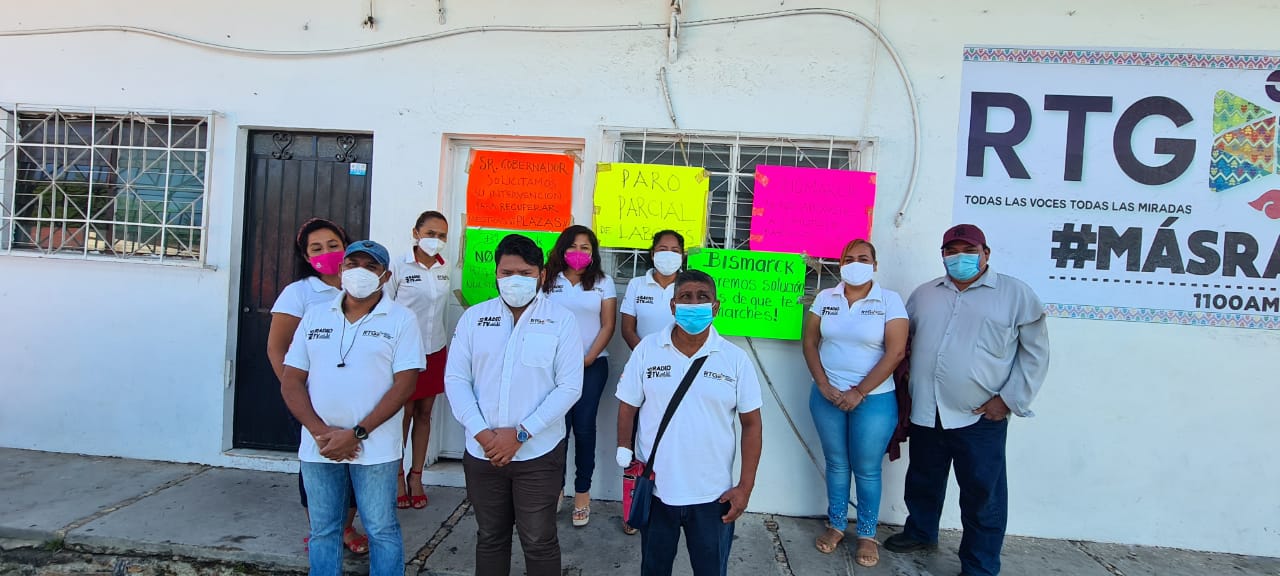La mañana de este jueves nueve trabajadores de la emisora 1100 AM incorporada a (RTG), con sede en la ciudad de Ometepec, colocaron carteles en la puerta de entrada y también en la ventana para que la ciudadanía se enterara de sus demandas.