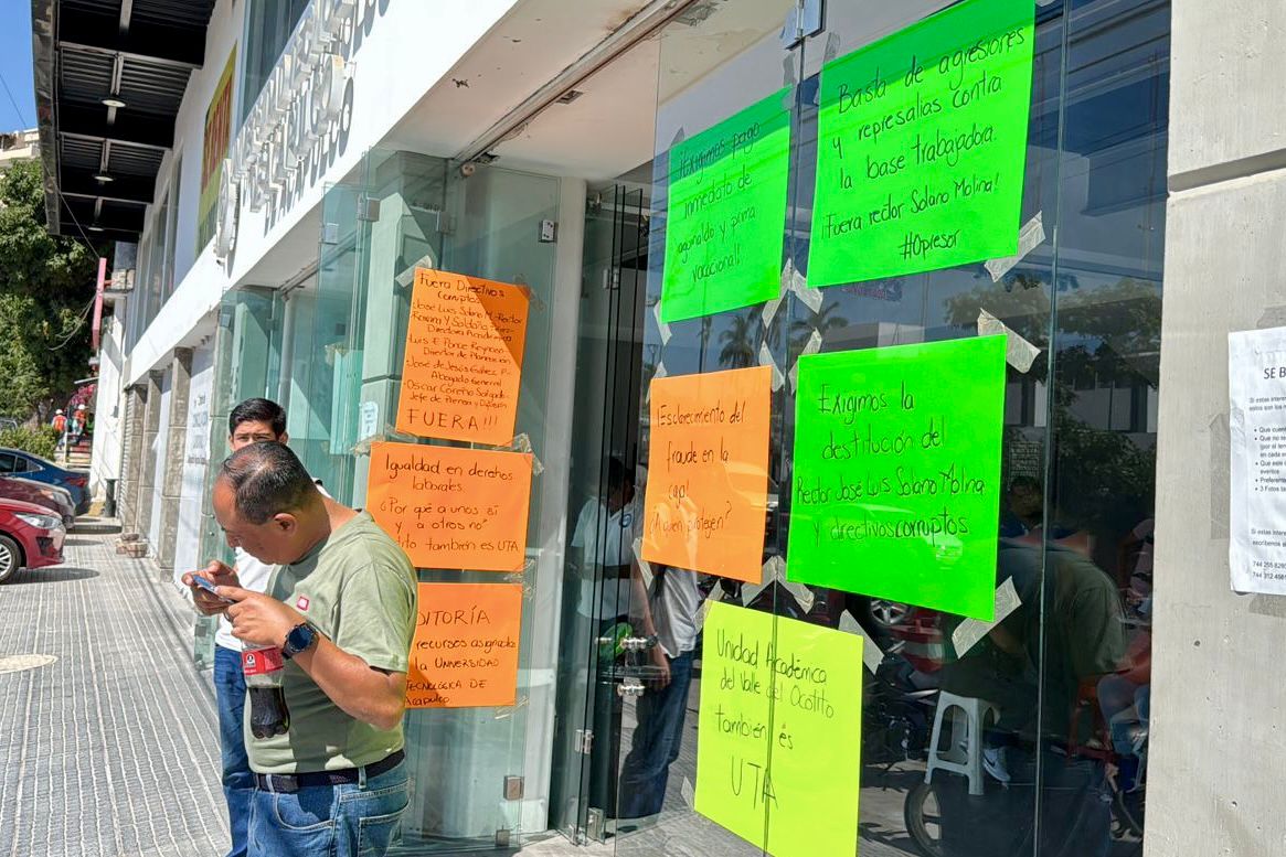 Acapulco; Gro.- Trabajadores sindicalizados de la Universidad Tecnológica de Acapulco tomaron las instalaciones de esa institución educativa para exigir el pago de aguinaldos, primas dominicales y otras prestaciones.