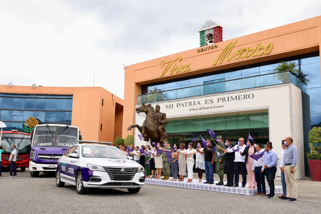 En el marco del Protocolo Violeta, la gobernadora, también entregó tres patrullas para reforzar las capacidades de la Policía Estatal, durante el banderazo de salida de las unidades de transporte público Violeta en Chilpancingo y Acapulco con cromáticas identificables para las usuarias, garantizando un orden en estricto apego a la Ley.