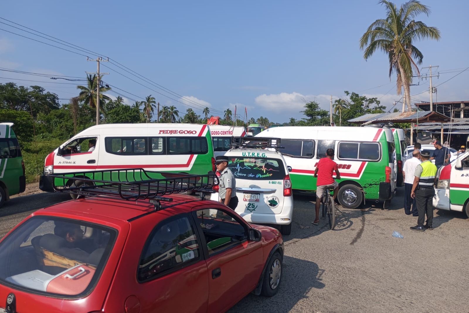 Acapulco; Gro.- Choferes del transporte público y colonos realizaron un bloqueo sobre la carretera federal Acapulco – Zihuatanejo por espacio de horas en Coyuca de Benítez, exigiendo apoyo tras el huracán John y reparación de vialidades.