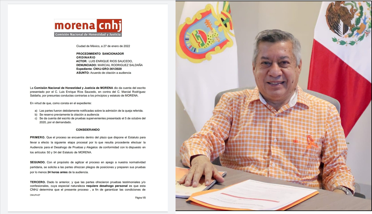 Chilpancingo, Gro., a 24 de febrero de 2022. – Mañana por la tarde el titular de la Secretaría de Educación Guerrero (SEG), Marcial Rodríguez Saldaña, deberá comparecer ante la Comisión Nacional de Honestidad y Justicia (CNHJ) de Morena, para rendir cuentas en una audiencia de desahogo de pruebas y alegatos, tras ser acusado de usurpación de funciones, esto por haberse autonombrado presidente del Comité Ejecutivo Estatal (CEE) del partido en Guerrero.