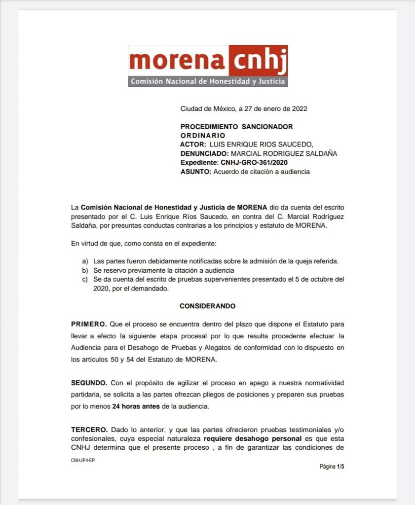 El pasado 27 de enero, la CNHJ emitió un acuerdo con el que se cita a Rodríguez Saldaña para que mañana a las 2 de la tarde acuda a las instalaciones de ese órgano partidista, en la Ciudad de México, para celebrar la audiencia.