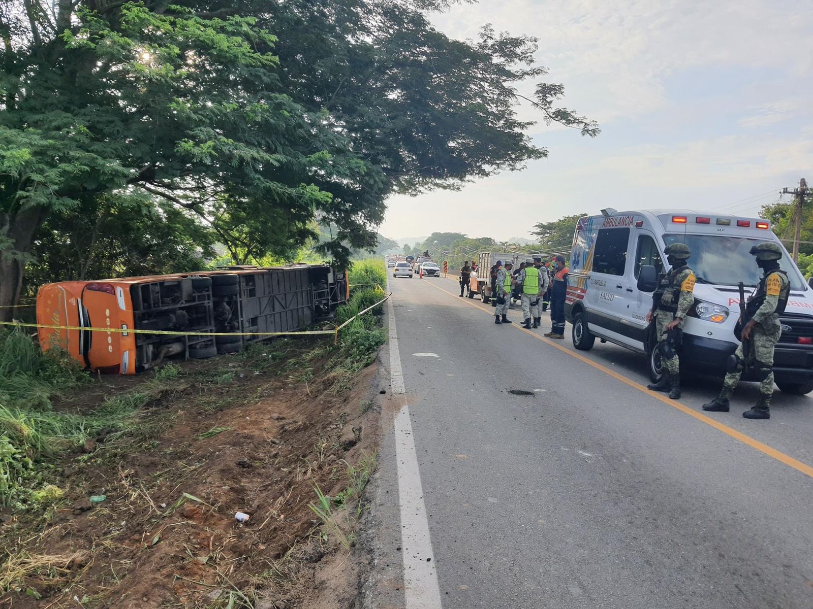 Acapulco, Gro., a 31 de julio de 2022.- Cuarenta pasajeros lesionados y una mujer muerta es el saldo preliminar que dejó la volcadura de un autobús turístico en la carretera federal Acapulco – Pinotepa Nacional en San Marcos.